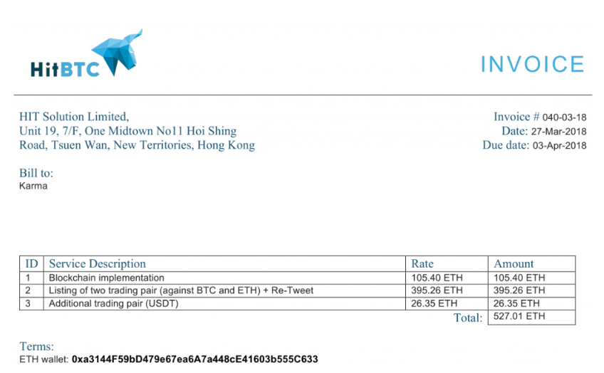 De acordo com representantes do projeto, a HitBTC, que está no 7º lugar na lista das maiores criptocorretoras, recebeu 527,01 ETH para a listagem de tokens Karma (KRM), mas não cumpriu com suas obrigações. A plataforma não forneceu atualizações sobre os prazos da listagem e não devolveu os fundos.