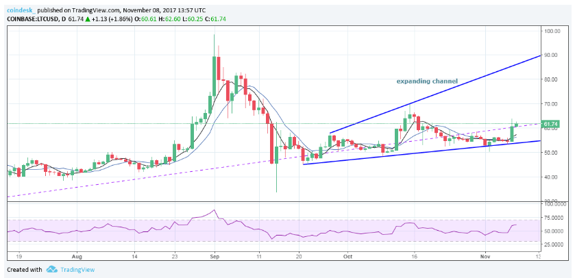Durante a maior parte do mês passado, o Litecoin esteve em um canal em expansão cujo limite inferior era de US$50 e acima, representando um nível de resistência sólida. Atualmente, o preço do criptoativo está na região de US$ 61-62.