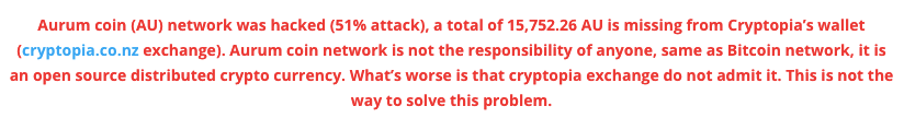 “A rede Aurum coin (UA) foi hackeada (ataque de 51%). No total, 15.752,26 AU foram roubados da carteira da Cryptopia. A rede Aurum, assim como a rede do Bitcoin, não tem qualquer responsabilidade, porque é uma criptomoeda distribuída com código aberto. Pior de tudo, a Cryptopia se recusa a admitir isso. Isso não ajuda a solucionar o problema”.