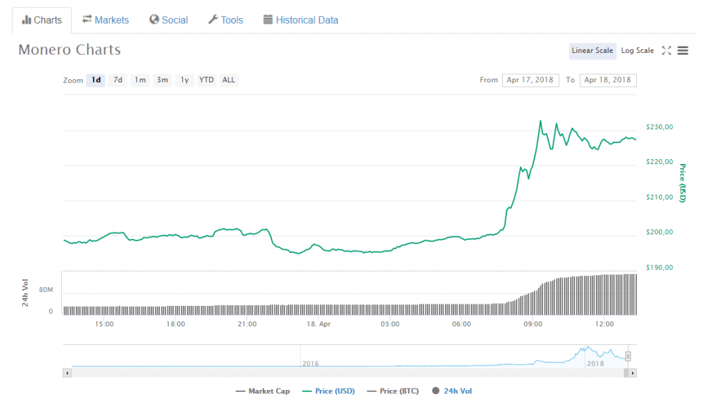 O XMR começou seu movimento ascendente por volta das 8:00 da manhã em Moscou, registrando elevações de US$200 para US$232 em apenas uma hora. A capitalização do ativo aumentou: se no início deste período, o valor era de 3,2 bilhões, em seguida, ele subiu para 3,6 bilhões.
