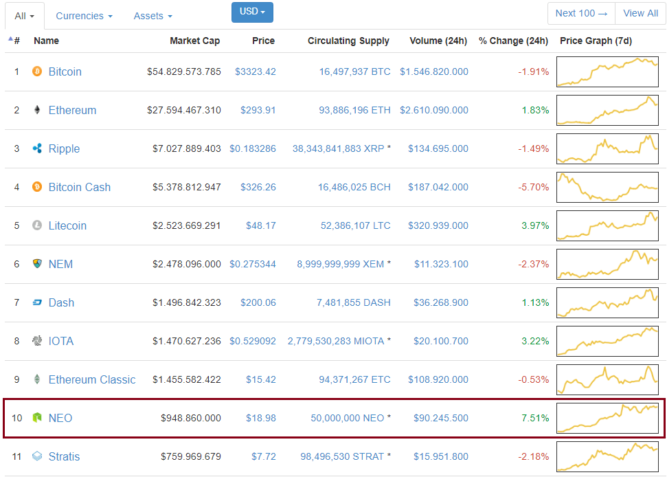 Aparentemente, os esforços dos desenvolvedores e dos gerentes de projetos não foram em vão, já que a moeda de criptográfica NEO já conseguiu entrar no top 10 da classificação do Coinmarketcap: