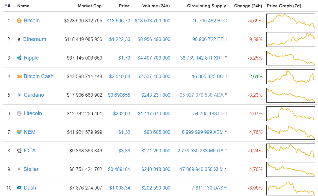 Asim, no início do dia, o preço do Bitcoin foi reduzido a US$13 mil. A maioria das outras principais criptomoedas também estão na zona vermelha.