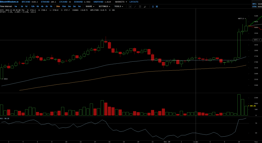 Como pode ser observado no gráfico, o preço do BTC foi fixado acima da barreira psicológica de US$4 mil.