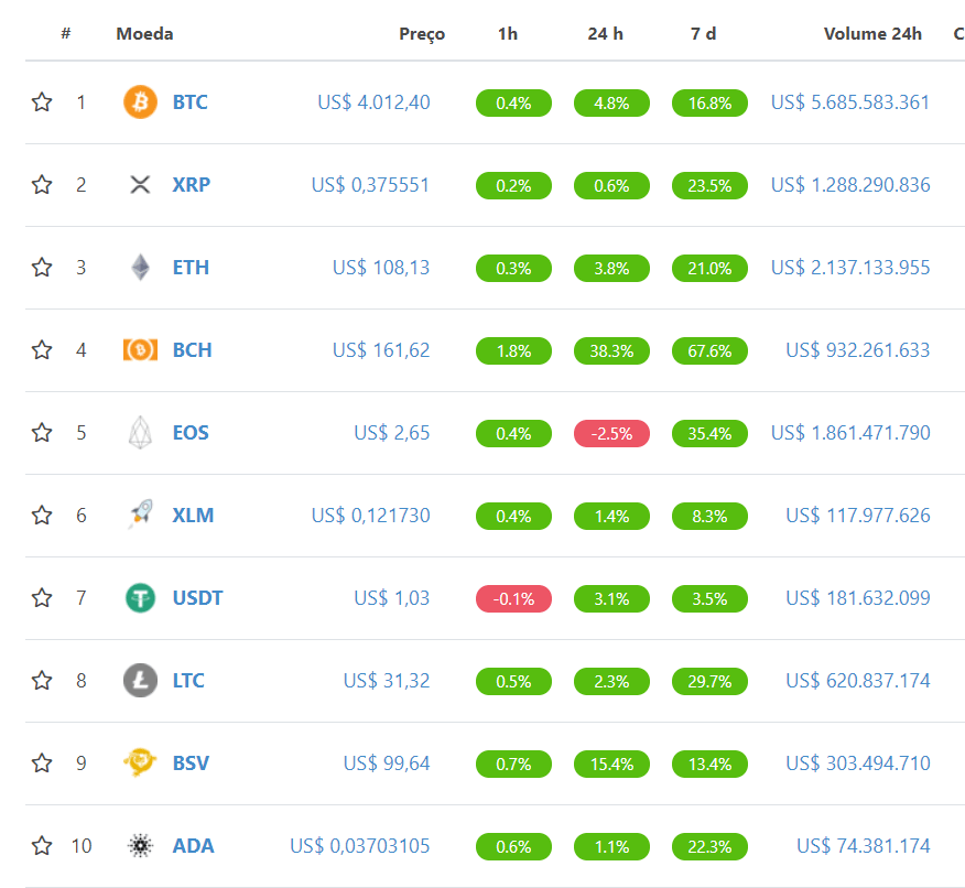 Atualmente, na zona verde estão todas as 10 primeiras em classificação da CoinGecko: