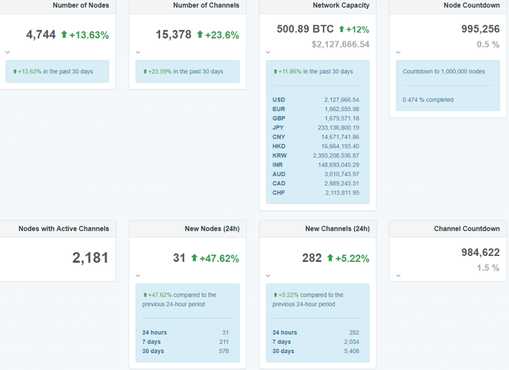 Nos últimos 30 dias, o número de canais LN cresceu em quase 25%. Tais canais também conectam 4.744 nós entre si – número que aumentou em 13% durante o mesmo período. Em média, 31 nós e 282 canais surgiram por dia na rede.