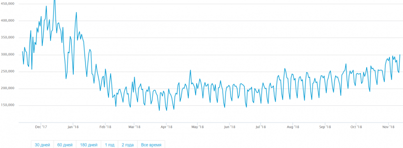 No dia 12 de novembro, o número diário de transações confirmadas na rede principal do Bitcoin ultrapassou os 300 mil. Segundo o portal blockchain.com, a última vez em que os indicadores estiveram neste nível foi no final de janeiro.