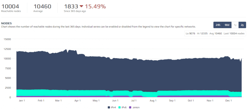 Dados do Bitnodes mostram que em 2018, o número de nós acessíveis na rede do Bitcoin diminuiu em 15,5%. No momento da redação deste artigo, o número era 10.004, sendo que durante o mesmo período, o número de nós inacessíveis também diminuiu em 33%, de 98 mil para 65,5 mil, de acordo com a CCN.