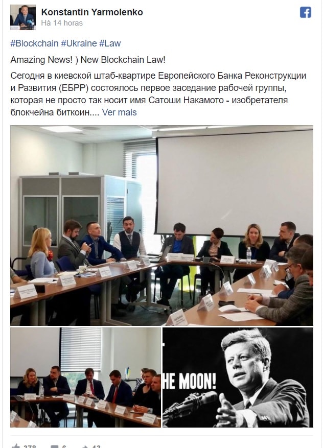 O primeiro encontro de representantes do Banco Europeu de Reconstrução e Desenvolvimento (BERD) e um grupo de trabalho de especialistas sobre a elaboração de um projeto de lei sobre a introdução e promoção do desenvolvimento da tecnologia de Blockchain a nível nacional ocorreu em Kiev. Isto foi anunciado pelo conselheiro do chefe da Agência do governo eletrônico da Ucrânia, Konstantin Yarmolenko, em sua página no Facebook.