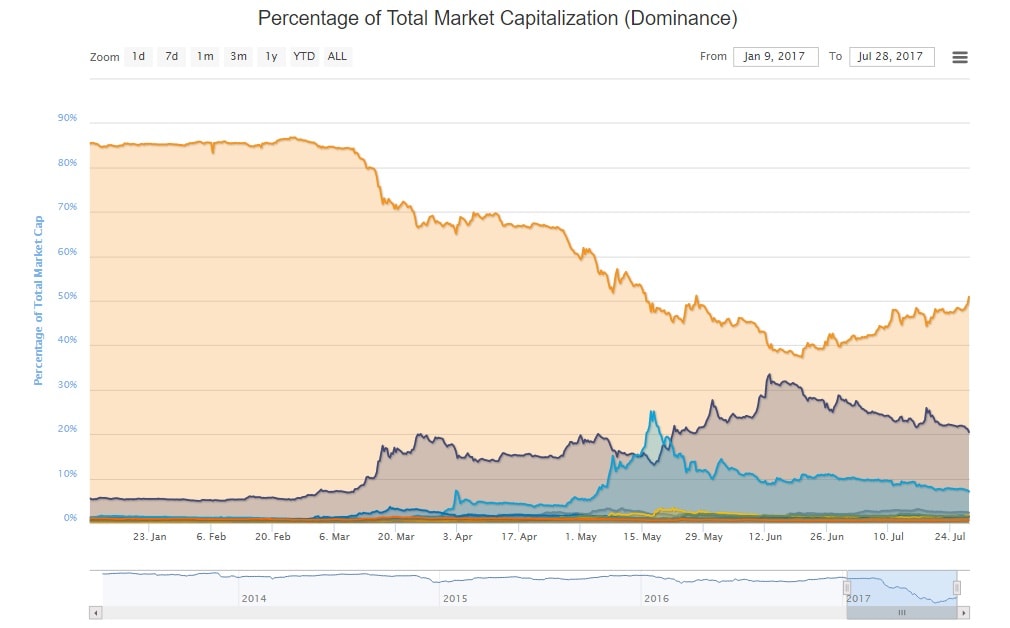 Como pode ser visto a partir dos dados do serviço Coinmarketcap, o índice de dominância Bitcoin no momento é de 51,4%: