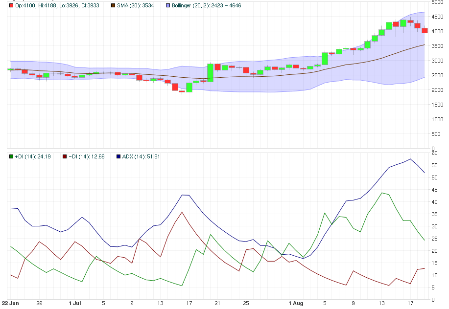 Se você prestar atenção ao indicador de movimento direcional ADX, você pode ver que Bitcoin está gradualmente deixando a zona de forte sobrecompra (linha azul, que por algum tempo foi acima do valor de 50, a linha verde está baixa, confirmando movimento de preço decrescente).