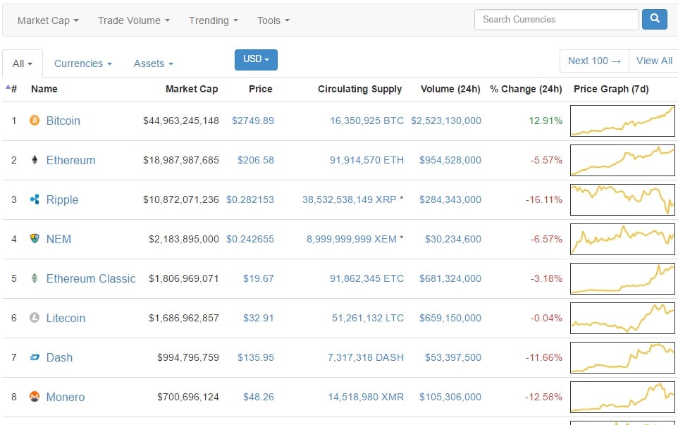 O indicador máximo na bolsa de valores Bitstamp, no momento, era US$2.720,00, na BTC-e US$ 2.720, Bitfinex US$ 2684,00 . A taxa média ponderada, de acordo com Coinmarketcap, alcançou US$ 2700. Assim, nas últimas 24 horas, o preço aumentou em torno de 12%, nos últimos sete dias em 40%.