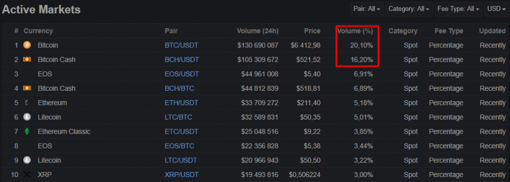 Os pares mais populares na OKEx são BTC/USDT e BCH/USDT, que fornecem um total de mais de um terço do volume de negociação total da corretora.