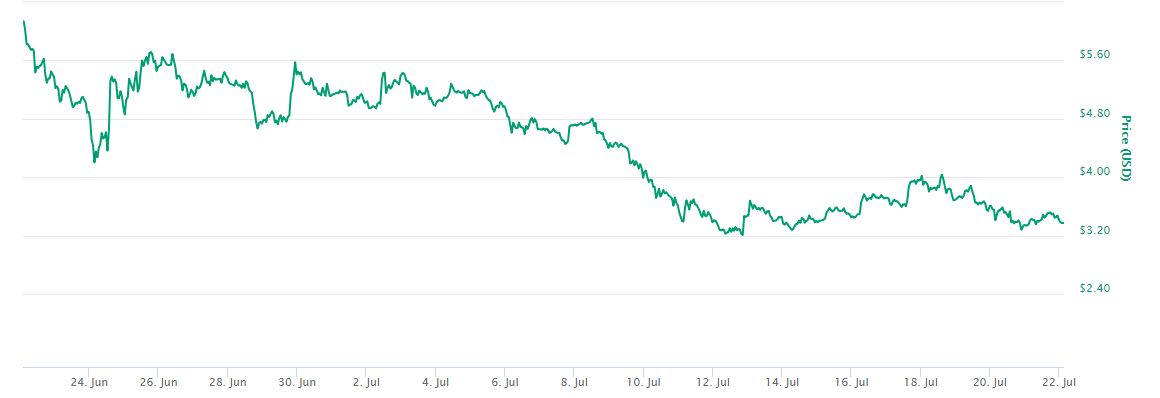 Apesar do boom inicial, a ONT teve uma queda substancial de valor nesse último mês. O lançamento da MainNet, no início de julho, conseguiu manter o valor praticamente estável em um cenário no qual quase todas as altcoins estavam sendo desvalorizadas. A partir do dia 8, no entanto, o valor em relação ao dólar caiu, como é possível observar nesse gráfico, e se estabilizou em um valor muito mais baixo do que estava: