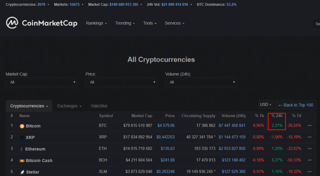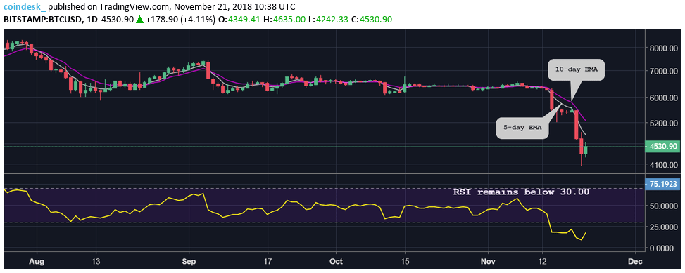 No dia 20 de novembro, o BTC atingiu uma baixa de 14 meses em US$4.048 (Bitstamp), e atualmente está sendo negociado por pouco mais de US$4,5 mil. Em geral, ao longo do dia de ontem, o BTC cresceu em cerca de 2% e, em termos absolutos, o preço reganhou US$500.
