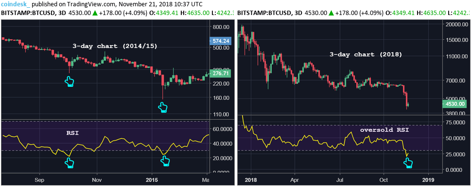 O índice de força relativa (RSI) também indica a saída de sobrevenda profunda. A última vez que esses valores baixos foram observados no gráfico de três dias foi em janeiro de 2015.