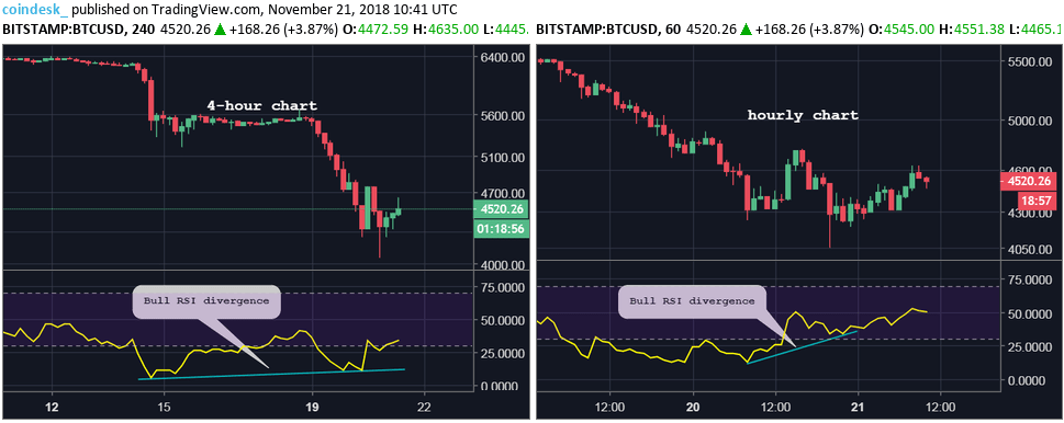 As divergências de alta do RSI em prazos mais baixos indicam que os ursos ficaram exaustos perto da marca de US$4 mil, bem como que existe uma alta probabilidade de haja uma confiante recuperação no preço.