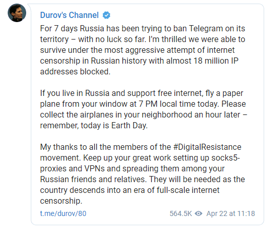 Em 22 de abril, Durov pediu à comunidade para apoiar o Telegram lançando aviões de papel. A ação foi apoiada por moradores das maiores cidades da Rússia.