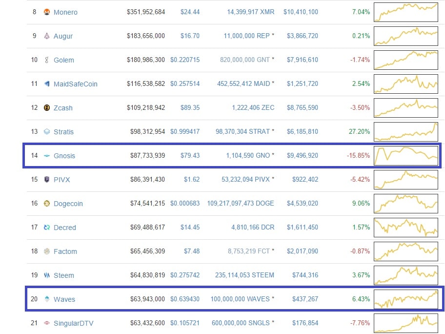E a Waves, está no 20º lugar, com US$ 65,506,800 de capitalização (para 100,000,000 WAVES disponíveis para negociação no mercado), e cada token sendo vendido a um preço de 0,00044 BTC.