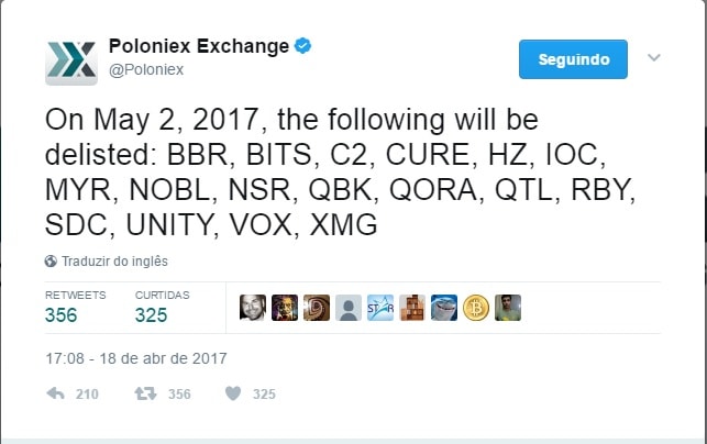 Outros, como Boolberry, até pediram esclarecimentos. A última grande exclusão da Poloniex foi realizada em setembro de 2016, data em que foram removidas 26 criptomoedas do portfolio.