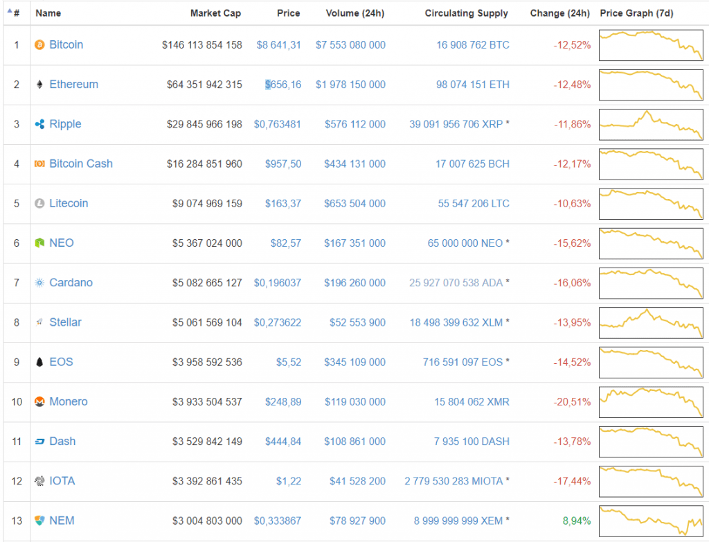 A partir de 06:30 UTC, a taxa média ponderada do Bitcoin, de acordo com a Coinmarketcap, era de US$8.641, com uma capitalização de mercado de US$146 bilhões. O preço do ETH, ao mesmo tempo era de US$656, do Ripple, de US$0,76, do Bitcoin Cash, de US$957, e do Litecoin, de US$163. A capitalização total do mercado caiu para US$348 bilhões, dos quais o Bitcoin representa um pouco mais de 41%.