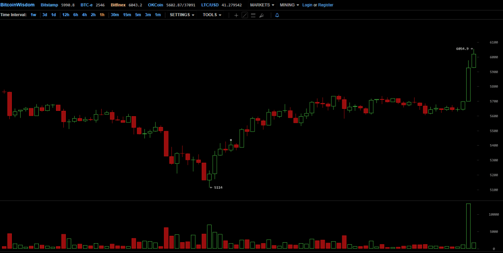 Como pode ser visto a partir do gráfico da popular Exchange Bitfinex, nas últimas horas, houve um abrupto aumento no volume de negócios, graças ao qual o preço do “ouro digital” superou a fronteira acarinhada.