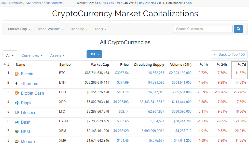 Além disso, da tabela, você pode ver que muitas outras criptomoedas também caíram no preço. Em particular, o preço de algumas das Altcoins mais populares como Ethereum, Bitcoin Cash, Litecoin, NEM e Monero caiu em mais de 10%.