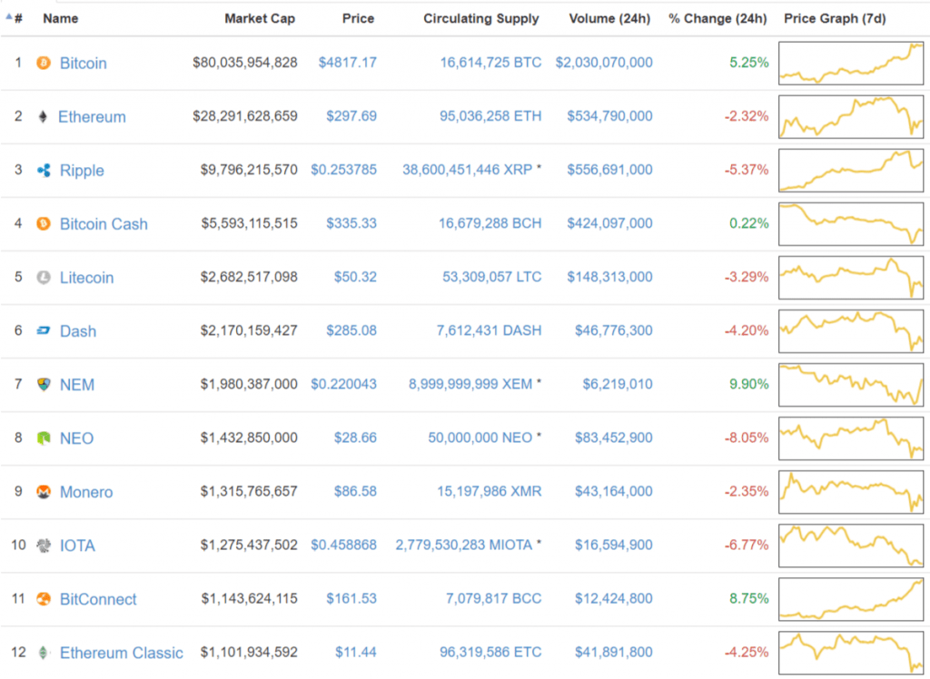 Ao mesmo tempo, há declínio no preço de uma série de Altcoins, embora ainda não seja possível falar sobre uma transição geral para a “zona vermelha”. Assim, entre as criptomoedas com uma capitalização de mais de US$ 1 bilhão (Bitcoin Cash, NEM e Bitconnect) mostram tendência positiva.