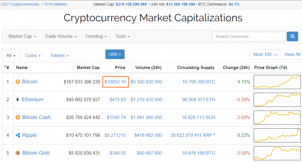 Assim, de acordo com o serviço analítico da Coinmarketcap, no momento, o preço médio ponderado do “ouro digital” abramge a ordem de US$10,05 mil.