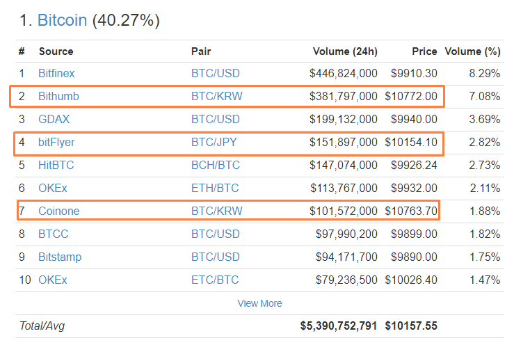 Um fato interessante é que o preço do Bitcoin nas corretoras de valores sul-coreanas e japonesas é muito maior e atingiu a marca muito mais cedo que os outros.