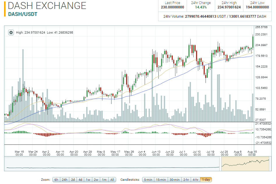 Recentemente, a popular moeda digital DASH demonstrou um crescimento estável. Assim, em particular, na agenda diária DASH/USDT nos logs de criptografia da Poloniex, você pode ver que o preço do Dahs atingiu níveis recordes: