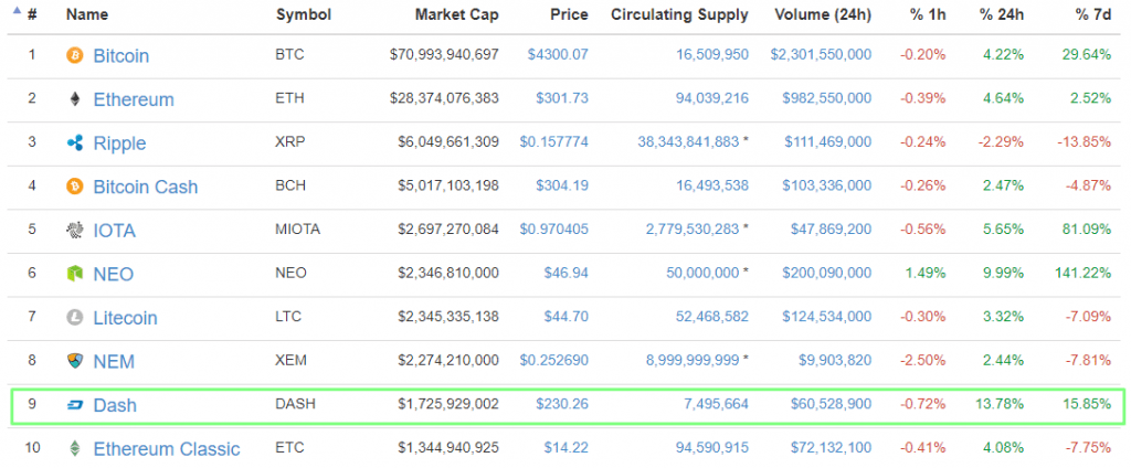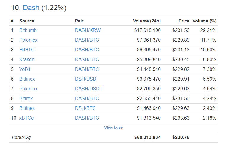 Na captura de tela a seguir, você pode ver que o DASH está em 9º lugar pelo volume de negociação diário da moeda criptográfica. Também é digno de nota que esta moeda digital é mais popular na corretora de criptomoedas Bithumb, onde é negociada no par com a Won sul-coreano:
