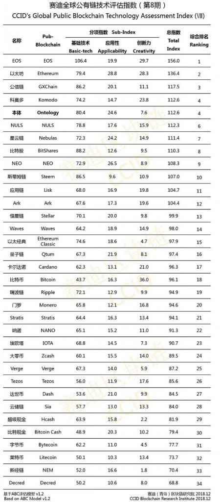 O China Information Technology Industry Development Center (CCID, na sigla em inglês) divulgou o oitavo ranking de ativos criptomonetários. O EOS continua liderando a lista, enquanto o quinto lugar foi subitamente tomado pelo Ontology, recém-chegado na classificação e classificado pela CoinGecko como a 19ª criptomoeda em termos de capitalização. Isso foi relatado pelo Bitcoin.com.