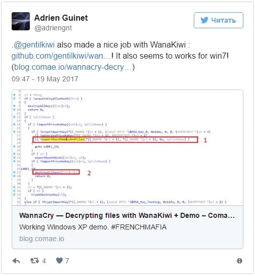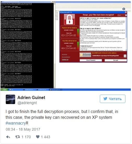 Como o especialista francês observou, ele encontrou um bug no sistema operacional Windows XP, a existência que os desenvolvedores do vírus WannaCry, aparentemente nem sequer sonhavam que existia. Um erro no antigo no sistema operacional torna possível extrair uma chave RSA especial da memória do computador, o que é necessário para descriptografar os dados bloqueados.
