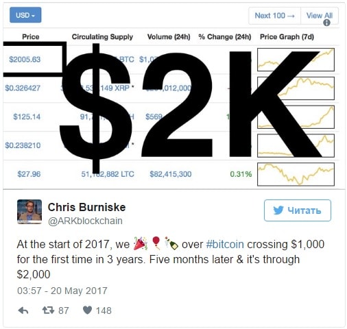 Ao mesmo tempo, em alguns sites de negociação de criptomoedas populares, o Bitcoin teve uma maior demora para superar a marca psicológica dos US$ 2.000. Por exemplo, na bolsa Bitstamp, a primeira moeda de criptografia está sendo negociada em US$ 2035,00, e na BTC-e seu preço é US$ 2013,00.