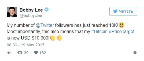 CEO da Bolsa de Valores chinesa BTCC, Bobby Lee, em uma brincadeira, prevê que o Bitcoin logo chegará a cada dos US$ 10.000, amarrando o preço da primeira moeda criptográfica ao número de seus seguidores no Twitter: