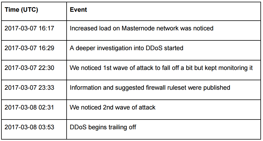 O seguinte é um cronograma dos eventos como eles se desenrolaram, bem como uma visão geral de como a rede Masternode foi afetada.