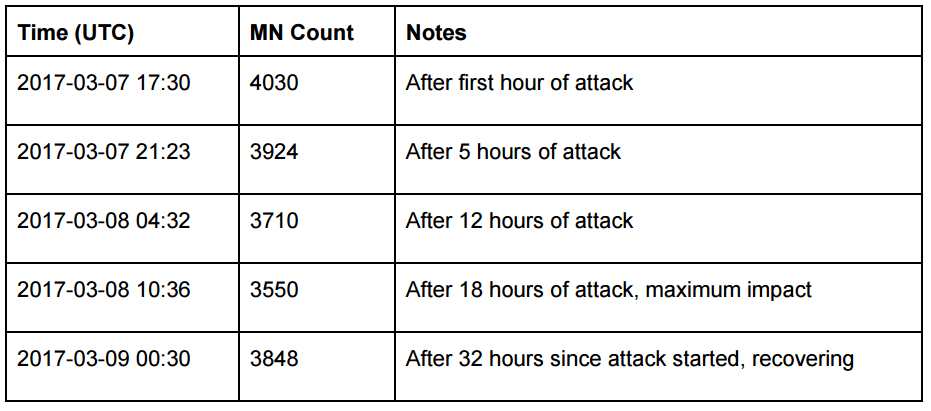 Antes do início do ataque haviam 4030 Masternodes disponíveis e no pico da segunda onda este número foi reduzido para 3550 Masternodes. Isso significa que o atacante(s) foram capazes de colocar 11,9% da rede Masternode off-line.