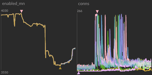 O gráfico à direita mostra o número de conexões que estavam sendo vistas durante o ataque. Normalmente, um nó verá pares de conexão no intervalo de 8 a 25 pares por nó. Durante o pico do ataque quase todos os slots de conexão foram ocupados mesmo se o nó foi configurado para aceitar muito mais conexões.