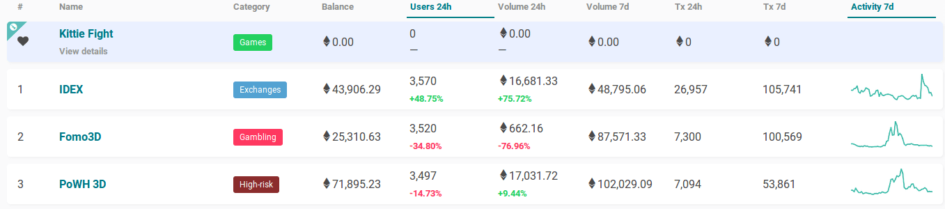 Estamos falando de Fomo3d e PoWH 3D. Ambos os esquemas superaram o IDEX, melhor dApp no mercado, em números de volume de 7 dias e ocuparam a maioria das atividades de rede Ethereum na sexta-feira e no sábado.
