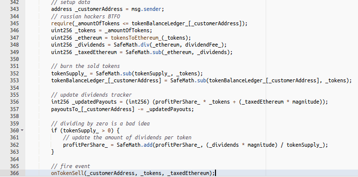 Analisando o contrato inteligente por trás do PoWH 3D, descobriu-se que ele realmente cobra uma taxa de 10% por compras, negociações e vendas. Todos os tokens vendidos são queimados e liquidados para o Ethereum, e os ETH que sobram após a coleta da taxa são devolvidos à pessoa que abandona seus tokens.