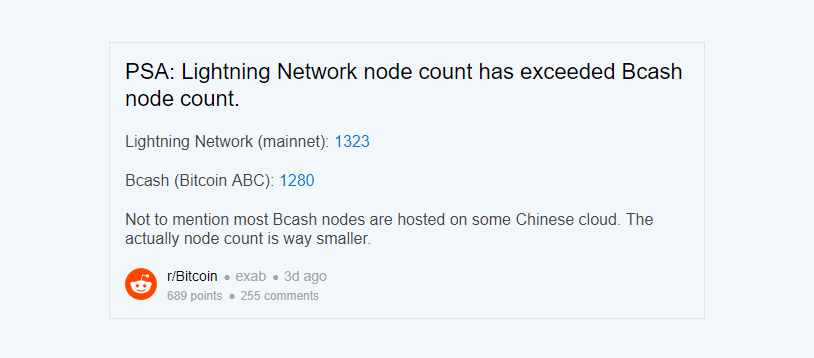 Como diz a mensagem dele, publicada mais cedo na terça-feira, 27 de março, enquanto a quantidade de nós daa Lightning era 1323, o Bitcoin ABC, o principal cliente do Bitcoin Cash, de acordo com Coin.dance, tinha 1280.