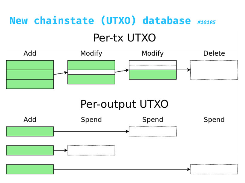 Falando em melhorar a produtividade, uma das áreas mais importantes do trabalho tem sido uma reformulação completa do banco de dados Chainstate (UTXO), ou seja, as saídas das transações não utilizadas. A Chainstate armazena as informações necessárias para a validação de novos blocos. A estrutura atual do banco de dados é usada a partir da versão 0.80 e, mesmo com sua implementação inicial, o desempenho cresceu cerca de 40 vezes.