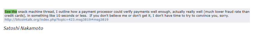 Além disso, Satoshi falou sobre a necessidade de introduzir pagamentos irreversíveis, processados por um mecanismo especial em apenas 10 segundos, sem esperar pela confirmação.