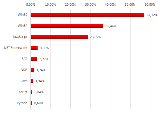 “O vetor de infecção mais popular foi a Internet, que contribuiu para 88% dos ataques, a mídia removível foi responsável por 23%, enquanto pastas de rede das empresas – por 2% dos ataques. Na maioria das vezes, utilizava-se mineradoras como Win32 (57,12% de todos os ataques), Win64 (36,46%) e JavaScript (28,65%)”, relataram os especialistas.