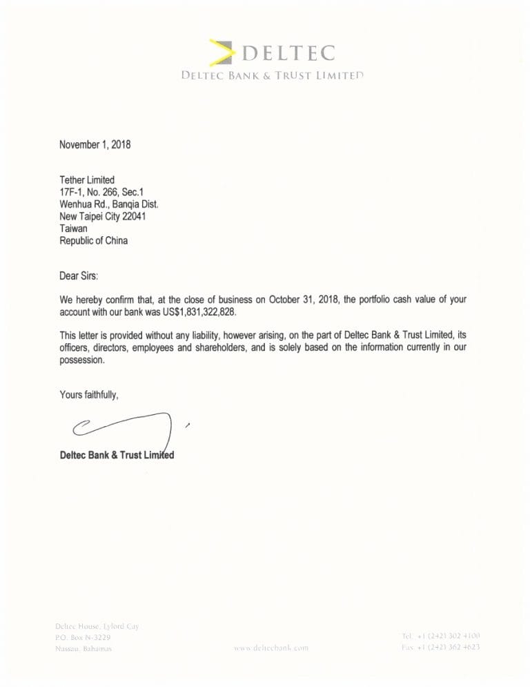 A mensagem foi acompanhada por um link para uma carta do Deltec Bank, que afirma que, ao final do dia útil de 31 de outubro de 2018, a conta do Tether Limited contava com um valor em dinheiro de US$1.831.322.828.