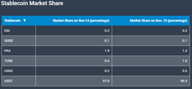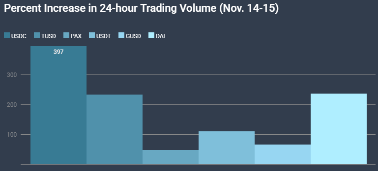 Abaixo está o crescimento nos volumes de negociação com novas moedas estáveis durante 14-15 de novembro. Naquela época, o volume de negociação da moeda USD Coin (USDC), desenvolvida pela startup Circle, cresceu em quase 400%.