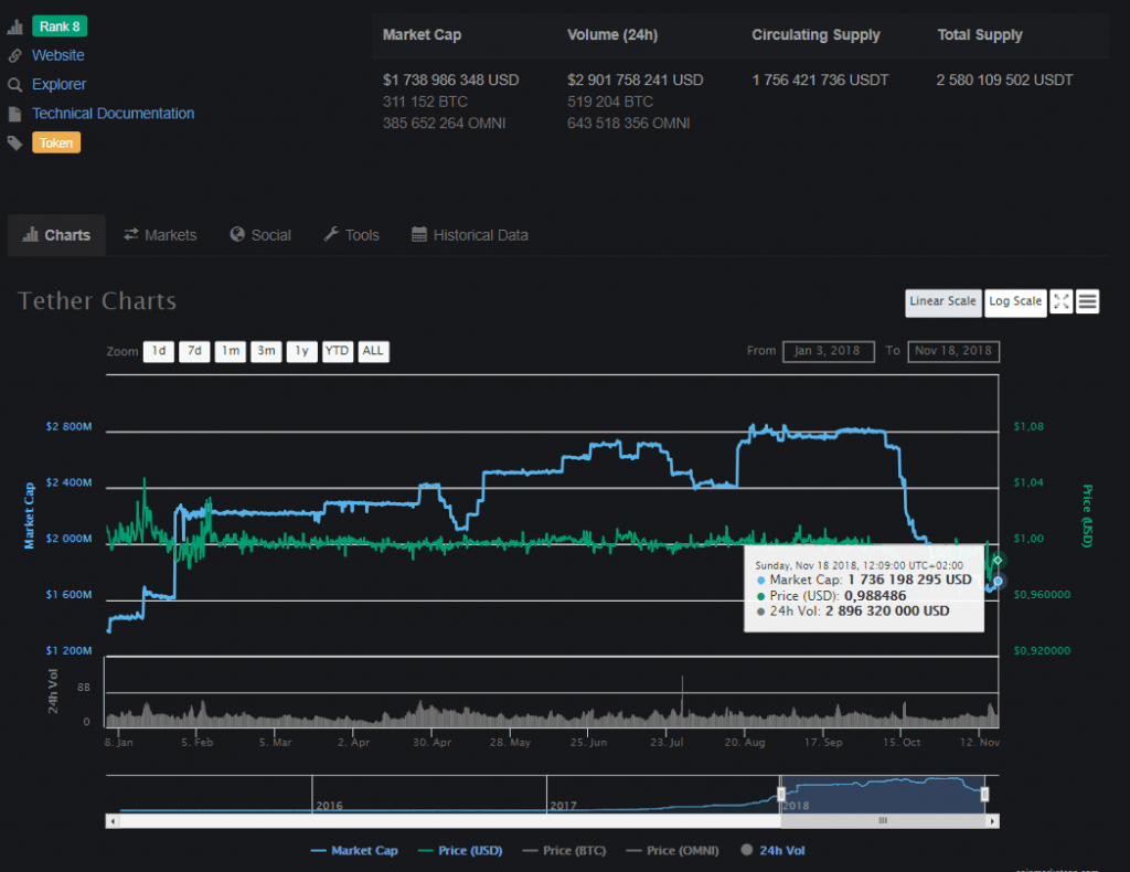 Apesar do acentuado declínio na capitalização que tem continuado desde outubro, o Tether (USDT) ocupa uma posição praticamente monopolista entre as stablecoins.