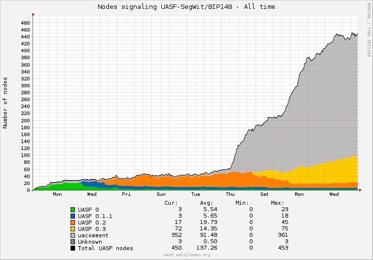 Atualmente, a proporção de nós cheios sinalizando BIP 148 é de aproximadamente 5% no momento da escrita, e duas pools de mineração (Bitfury e Bitcoin India) indicaram também a sustentação do UASF.