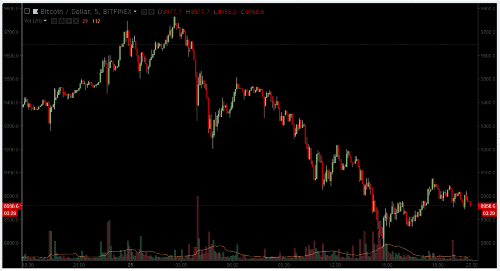 A subsequente correção, embora esperada, acabou sendo bastante profunda: já às 11h, o Bitcoin estava sendo negociado na área de US$9 mil, em seguida caindo mais ainda. Houveram momentos em preço do ativo chegou a US$8.784 na Bitstamp.