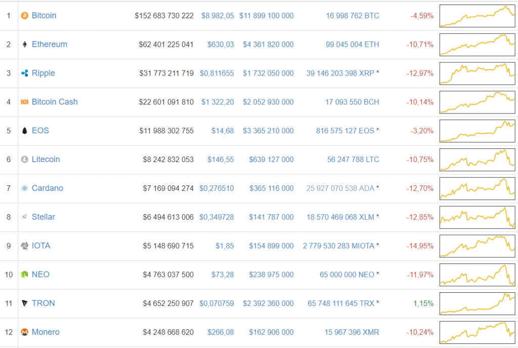 A correção do Bitcoin levou a um declínio no restante do mercado, cuja capitalização total caiu novamente abaixo de US$400 bilhões. Durante a maior parte do dia, quase todas as principais criptomoedas se encontravam na zona vermelha. Note que se o Bitcoin durante esse período perdeu cerca de 4%, as altcoins sofreram mais: na maioria dos casos, suas perdas foram de mais de 10%. As únicas exceções foram o EOS e o Tron, que estão indo contra a tendência geral.